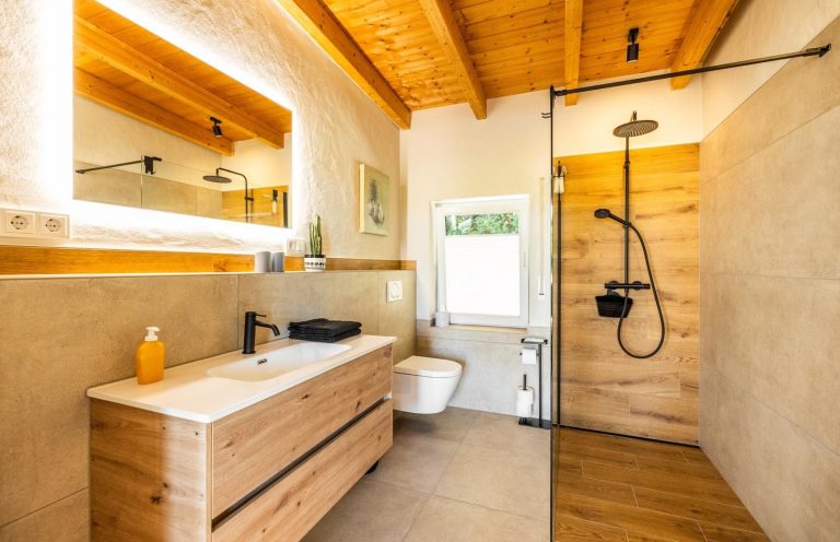 Komfort und hochwertige Materialien machen das Bad zu einem Ort, an dem man sich gerne aufhält. Perfekt, um nach einem aktiven Tag in der Eifel zur Ruhe zu kommen und sich etwas Gutes zu tun.